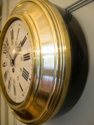 Dit is wel een heel bijzondere pub klok. Deze klok heeft een dubbele wijzerplaat. Dergelijke klokken hingen in het Victoriaanse Engeland van de 19e eeuw vaak aan het plafond van een bibliotheek, een stations gebouw of bijvoorbeeld een gemeentehuis. Allemaal openbare (PUBlic) gebouwen. Je kunt dus van beide kanten zien hoe laat het is.