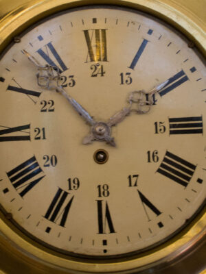 Het zeer zware uurwerk heeft een snek constructie en stuurt dus 2 wijzerplaten aan. Als je de wijzers aan de ene kant gelijk zet dan lopen de andere wijzers meteen mee. Werkelijke een uniek object.